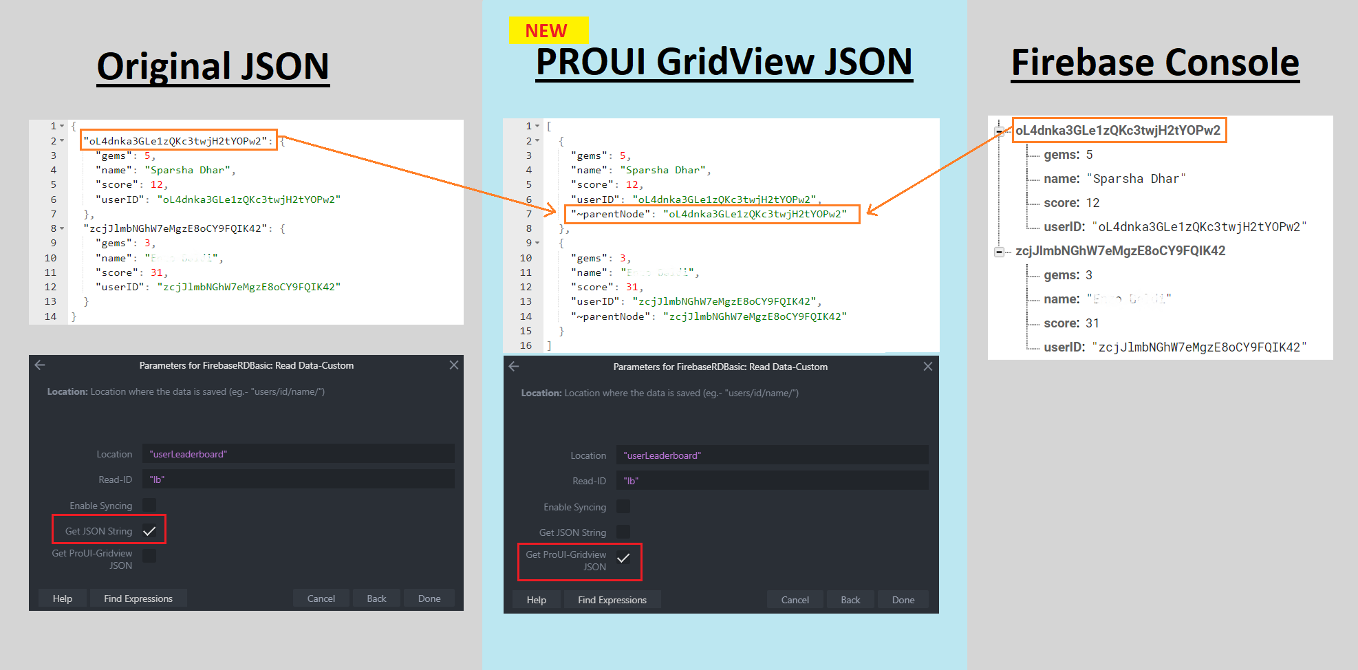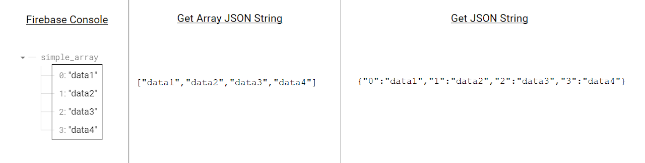 Data in Firebase Console (left), Read action result from Get Array JSON String (middle), Read action result from Get JSON String (right)