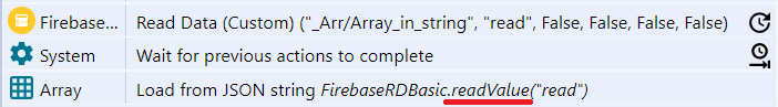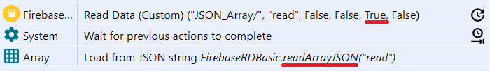 Data in Firebase Console (left), Read action result from Get Array JSON String (right)