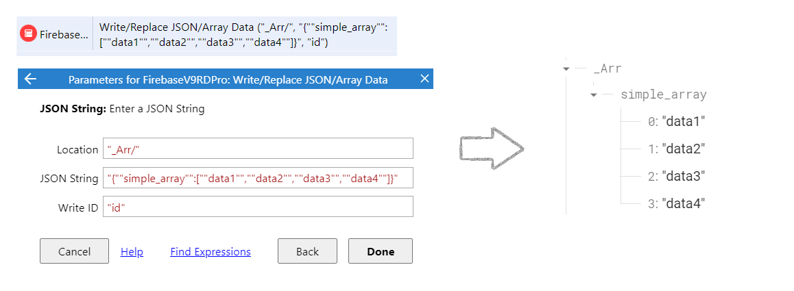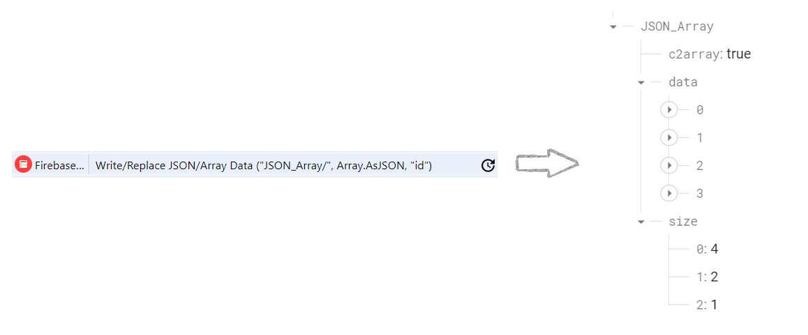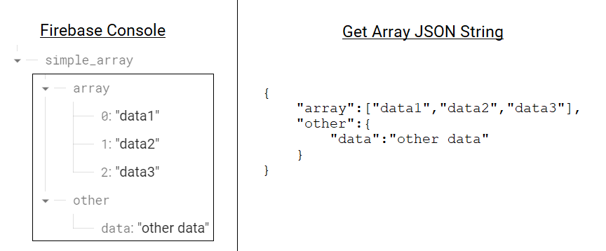 How to write Array's JSON data (left), Data in Firebase Console (right)