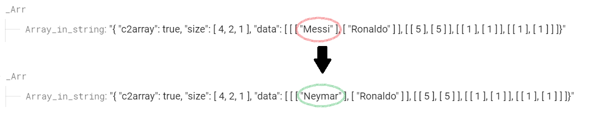 However what is the problem with writing an Array data as a single string? The answer is, you have less control over the array data string. If you need to change a single data in that array string, you will need to rewrite the whole array. For example, you want to change "Messi" to "Neymar". To do this you would need to rewrite the whole string and that would cost you unnecessary data usage.