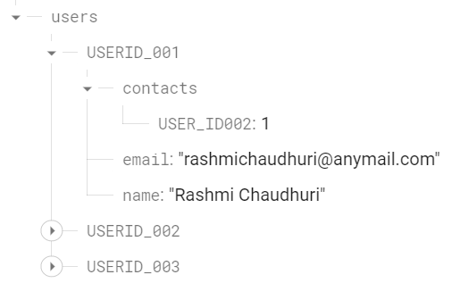 For example, consider a chat application that allows users to store a basic profile and contact list. A typical user profile is located at a path, such as /users/$user_id. The user Rashmi Chaudhuri might have a database entry that looks something like this: