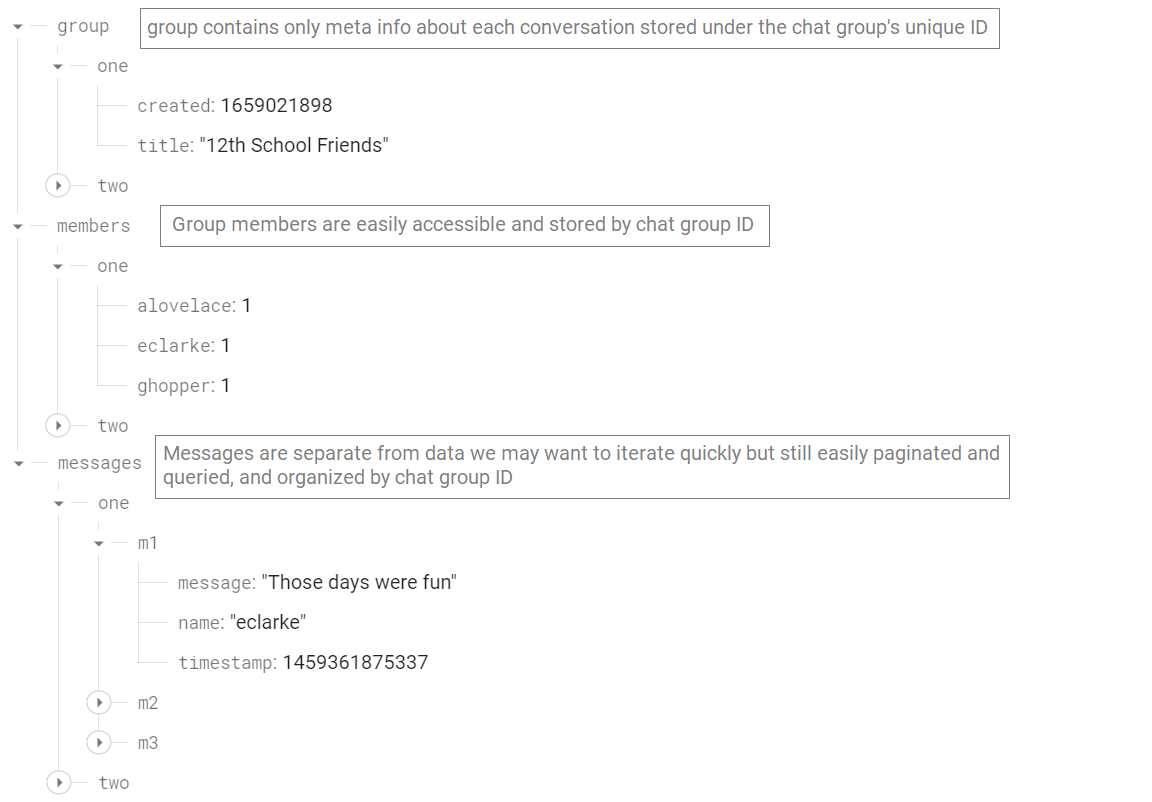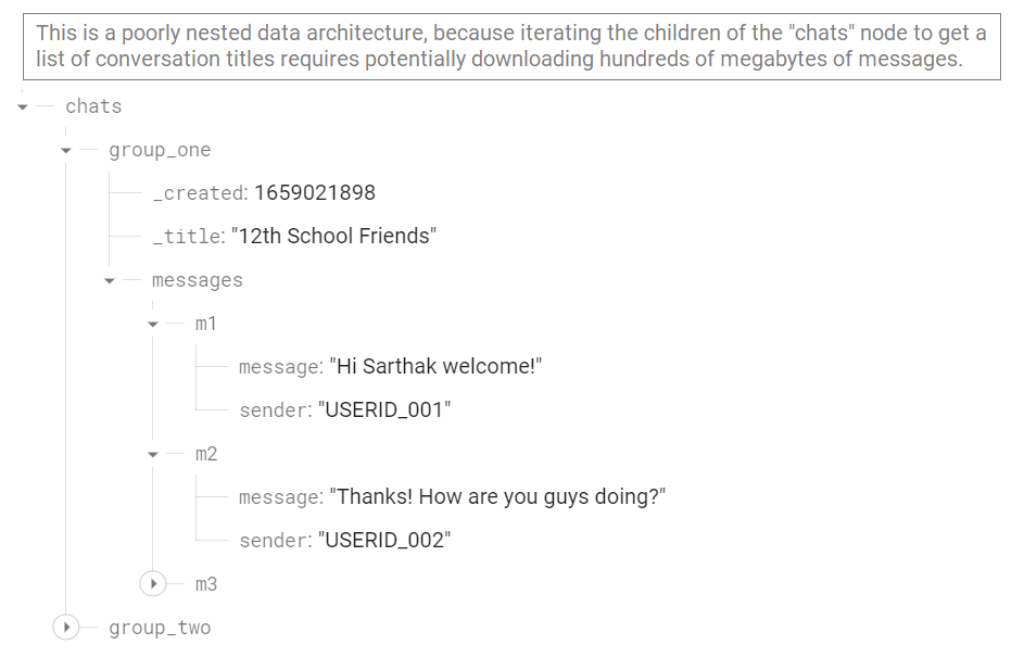 With this nested design, iterating through the data becomes problematic. For example, listing the titles of chat conversations requires the entire chats tree, including all members and messages, to be downloaded to the client.