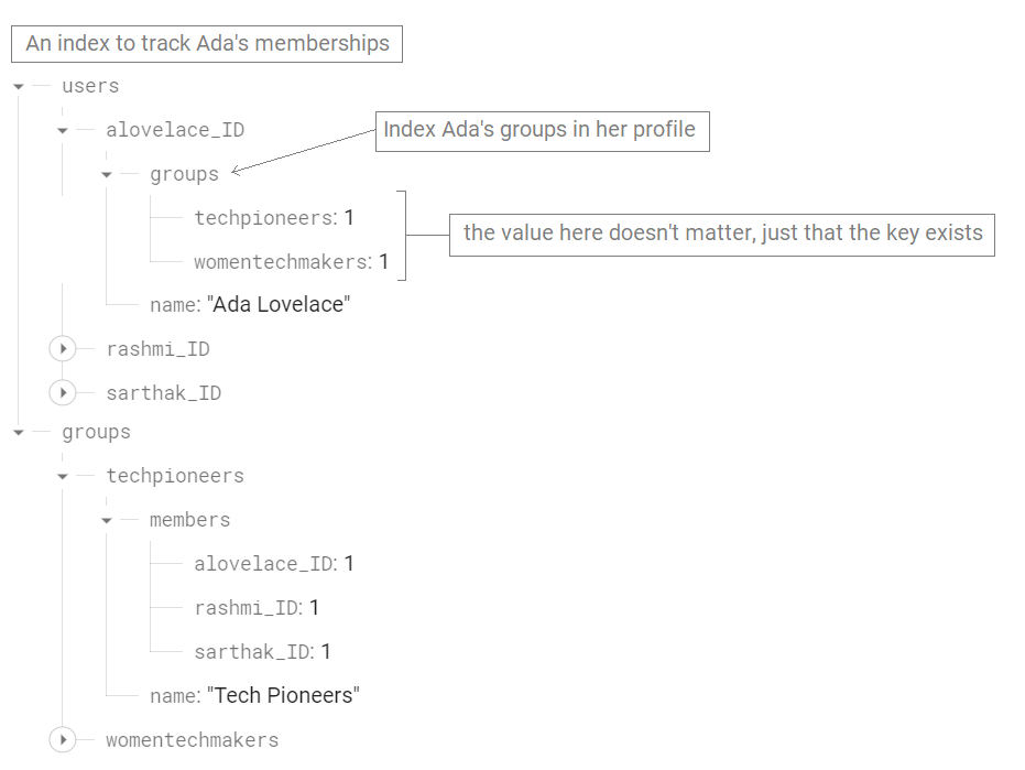 You might notice that this duplicates some data by storing the relationship under both Ada's record and under the group. Now alovelace is indexed under a group, and techpioneers is listed in Ada's profile. So to delete Ada from the group, it has to be updated in two places.