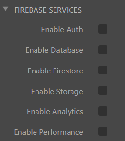 - In the Firebase SDK plugin, Enable the Firebase Services you need in your project
