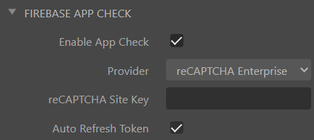 Register your apps to use App Check with the reCAPTCHA Enterprise provider in the App Check section of the Firebase console. You will need to provide the site key you got in the previous step. You usually need to register all of your project's apps, because once you enable enforcement for a Firebase product, only registered apps will be able to access the product's backend resources.