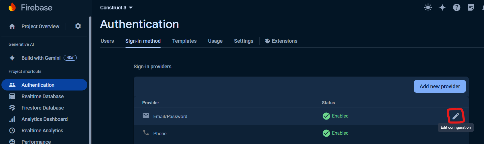 - Enable the required Sign-in providers by clicking on the Pencil icon