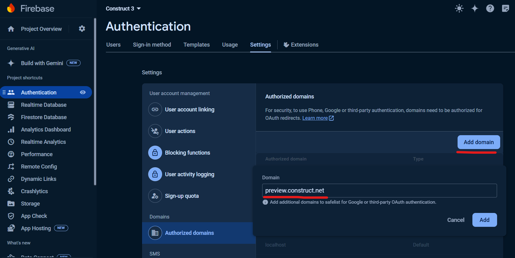 - You must add an authorized domain. Go to Settings > Authorized domains > Click on Add domain and enter
