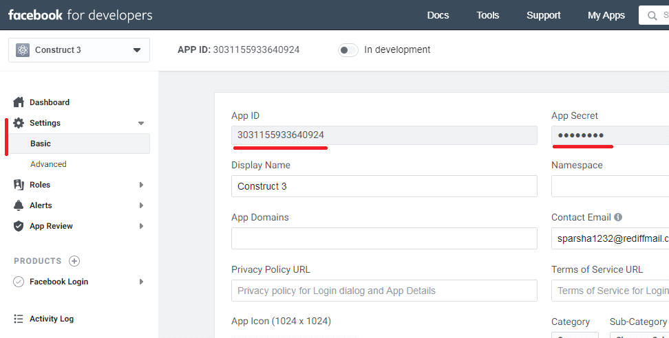 - Click on the "In development" Toggle Button to turn on "Live" Settings for your Facebook App.