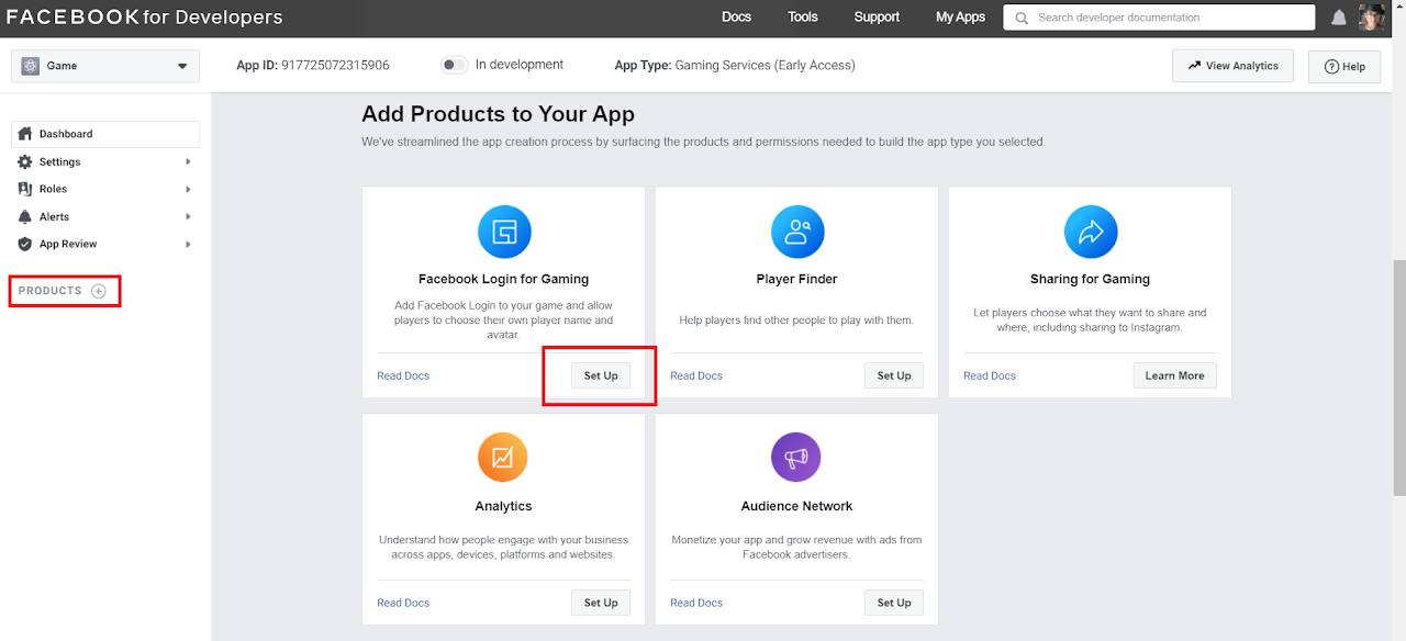 - Click on the Products "+" icon from the left panel and then click on Set Up button under Facebook Login card.