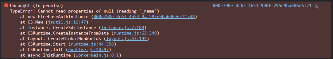 Cannot read properties of null (reading '_name') ?This error means that you need to Choose the SDK Plugin in the plugin properties for all of the Firebase plugins that you have added to your project.