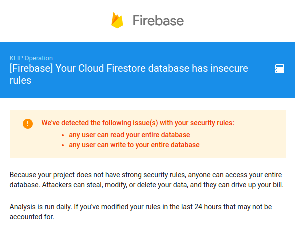 If you have ever received an email like this from Firebase, it is likely that you Security Rules allows anyone to read/write to your database or storage.